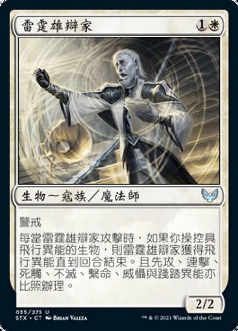 |  Variations— Parts— | Thunderous Orator2 / 2 Vigilance Whenever this creature attacks, it gains flying until end of turn if you control a creature with flying. The same is true for first strike, double strike, deathtouch, indestructible, lifelink, menace, and trample.