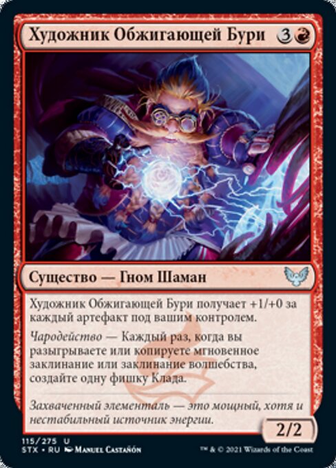|  Variations— Parts— | Artista della Fornace Tempesta2 / 2 L'Artista della Fornace Tempesta prende +1/+0 per ogni artefatto che controlli. Artemagica — Ogniqualvolta lanci o copi una magia istantaneo o stregoneria, crea una pedina Tesoro.