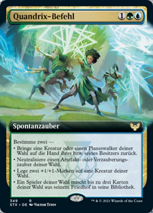 |  Variations : 1Parts— | Comando di QuandrixScegli due — • Fai tornare una creatura o un planeswalker bersaglio in mano al suo proprietario. • Neutralizza una magia artefatto o incantesimo bersaglio. • Metti due segnalini +1/+1 su una creatura bersaglio. • Un giocatore bersaglio rimescola nel suo grimorio fino a tre carte bersaglio dal suo cimitero.