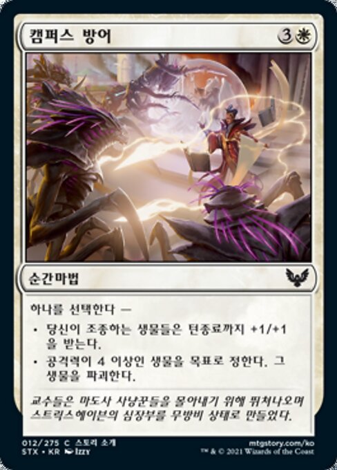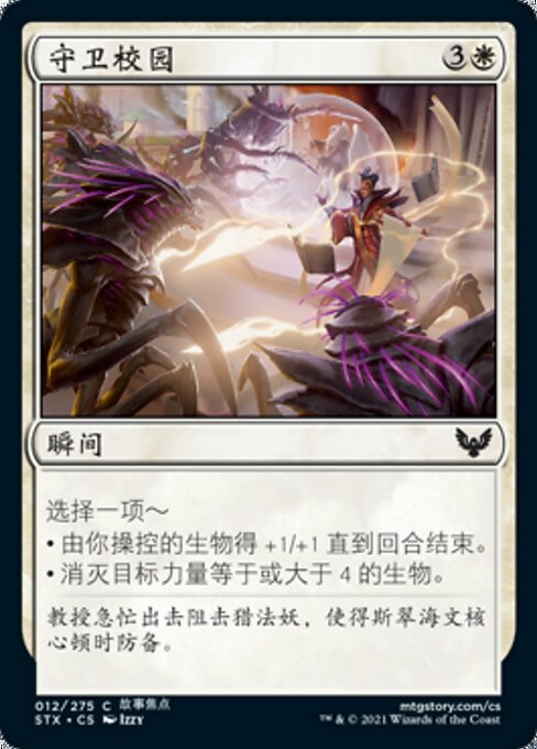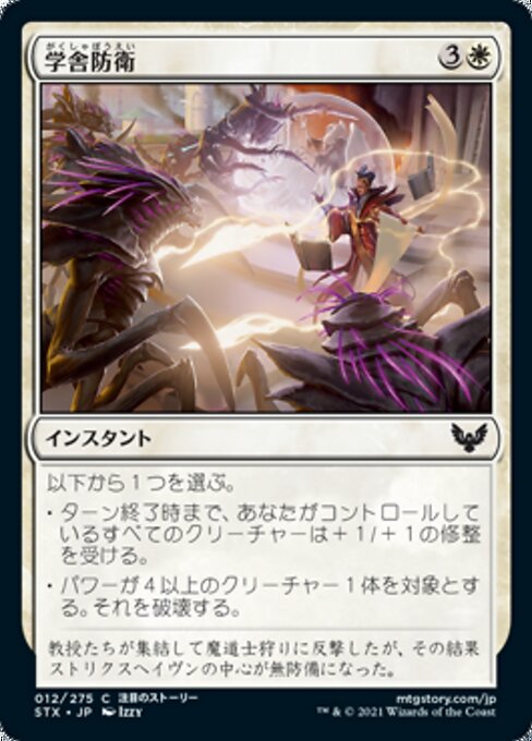 ![]() Variations— Parts— | 学舎防衛以下から1つを選ぶ。 • ターン終了時まで、あなたがコントロールしているすべてのクリーチャーは+1/+1の修整を受ける。 • パワーが4以上のクリーチャー1体を対象とする。それを破壊する。