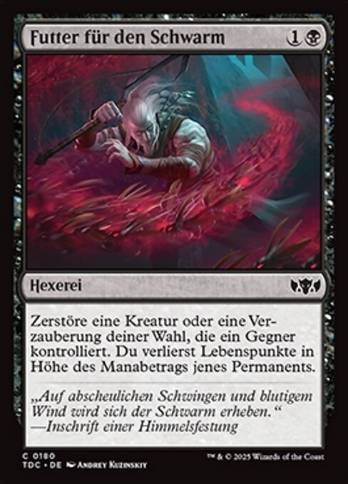 ![]() Variations— Parts— | Feed the SwarmDestroy target creature or enchantment an opponent controls. You lose life equal to that permanent's mana value.