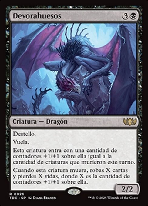 |  Variations : 1Parts— | Bone Devourer2 / 2 Flash Flying This creature enters with a number of +1/+1 counters on it equal to the number of creatures that died this turn. When this creature dies, you draw X cards and you lose X life, where X is the number of +1/+1 counters on it.