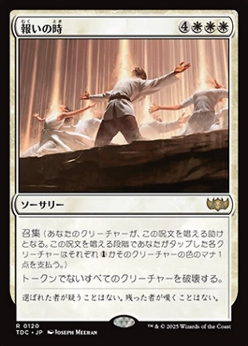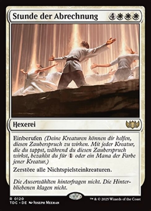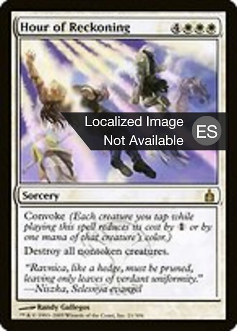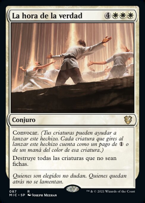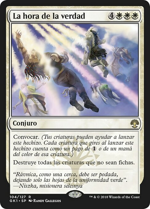 ![]() Variations— Parts— | La hora de la verdadConvocar. (Tus criaturas pueden ayudar a lanzar este hechizo. Cada criatura que gires al lanzar este hechizo cuenta como un pago de Destruye todas las criaturas que no sean fichas.