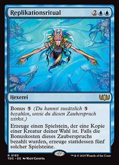 |  Variations— Parts— | Rito de replicaciónEstímulo  Crea una ficha que es una copia de la criatura objetivo. Si este hechizo fue estimulado, en vez de eso, crea cinco de esas fichas.
