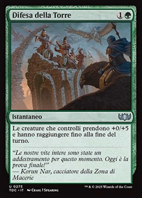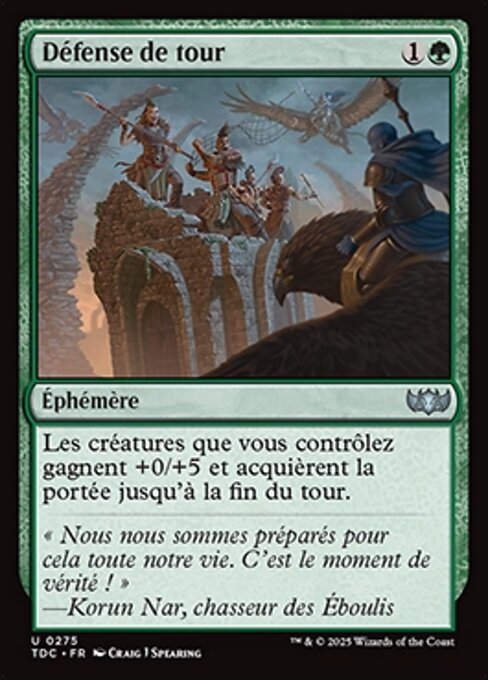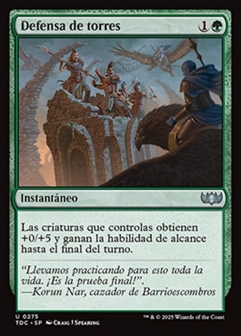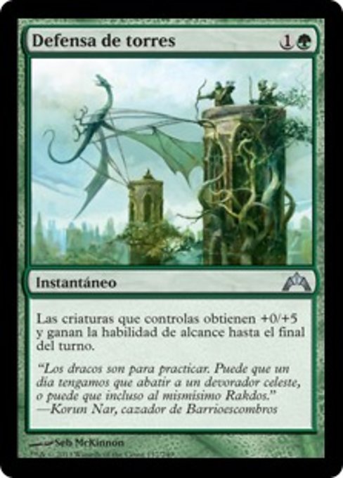 ![]() Variations— Parts— | Defensa de torresLas criaturas que controlas obtienen +0/+5 y ganan la habilidad de alcance hasta el final del turno.