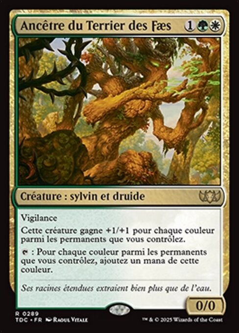 ![]() Variations— Parts— | Anciana del Cubil Feérico0 / 0 Vigilancia. Esta criatura obtiene +1/+1 por cada color entre los permanentes que controlas.