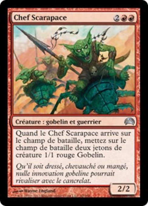 ![]() Variations— Parts— | Chef Scarapace2 / 2 Quand cette créature arrive, créez deux jetons de créature 1/1 rouge Gobelin.
