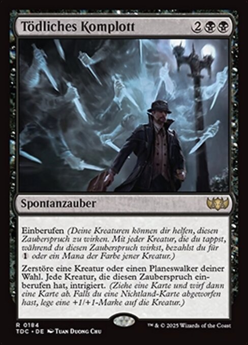 |  Variations— Parts— | Intrigo LetaleConvocazione (Le tue creature possono aiutarti a lanciare questa magia. Ogni creatura che TAPpi mentre lanci questa magia corrisponde al pagamento di  Distruggi una creatura o un planeswalker bersaglio. Ogni creatura che ha convocato questa magia complotta. (Pesca una carta, poi scarta una carta. Se hai scartato una carta non terra, metti un segnalino +1/+1 su quella creatura.)