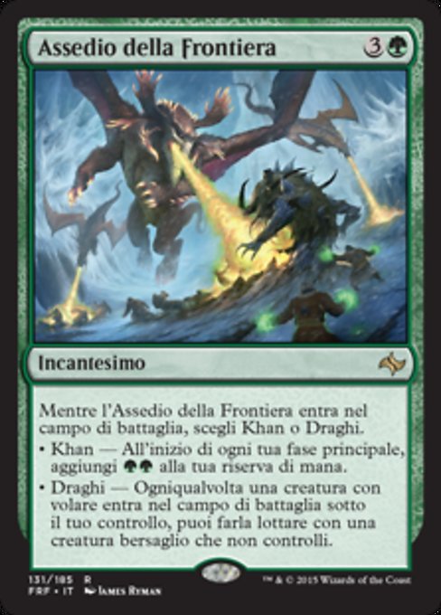 ![]() Variations— Parts— | Assedio della FrontieraMentre questo incantesimo entra, scegli Khan o Draghi. • Khan — All'inizio di ogni tua fase principale, aggiungi • Draghi — Ogniqualvolta una creatura con volare che controlli entra, puoi farla lottare con una creatura bersaglio che non controlli.