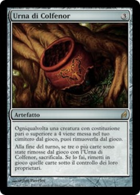![]() Variations— Parts— | Urna di ColfenorOgniqualvolta una creatura con costituzione pari o superiore a 4 viene messa nel tuo cimitero dal campo di battaglia, puoi esiliarla. All'inizio della sottofase finale, se sono state esiliate tre o più carte con questo artefatto, sacrificalo. Se lo fai, rimetti sul campo di battaglia quelle carte sotto il controllo dei rispettivi proprietari.