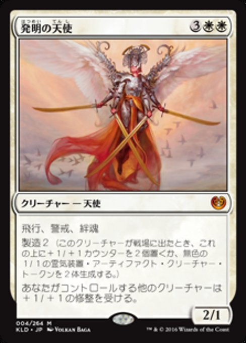 |  Variations— Parts— | 発明の天使2 / 1 飛行、警戒、絆魂 製造2(このクリーチャーが戦場に出たとき、これの上に+1/+1カウンター2個を置くか、無色の1/1の霊気装置・アーティファクト・クリーチャー・トークン2体を生成する。) あなたがコントロールしていてこれでないすべてのクリーチャーは+1/+1の修整を受ける。