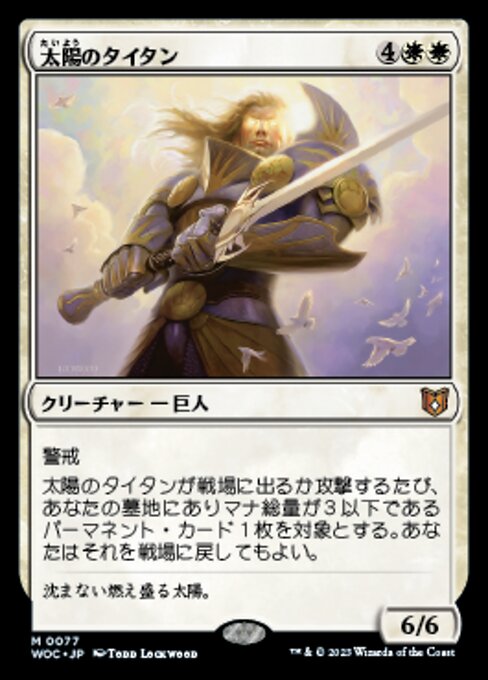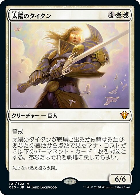 |  Variations— Parts— | 太陽のタイタン6 / 6 警戒 このクリーチャーが戦場に出るか攻撃するたび、あなたの墓地にありマナ総量が3以下であるパーマネント・カード1枚を対象とする。それを戦場に戻してもよい。