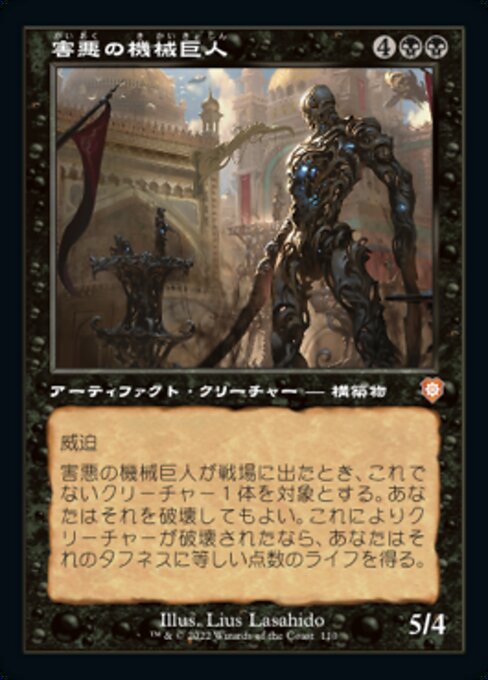 |  Variations— Parts— | 害悪の機械巨人5 / 4 威迫 このクリーチャーが戦場に出たとき、これでないクリーチャー1体を対象とする。それを破壊してもよい。これによりクリーチャーが破壊されたなら、あなたはそれのタフネスに等しい点数のライフを得る。