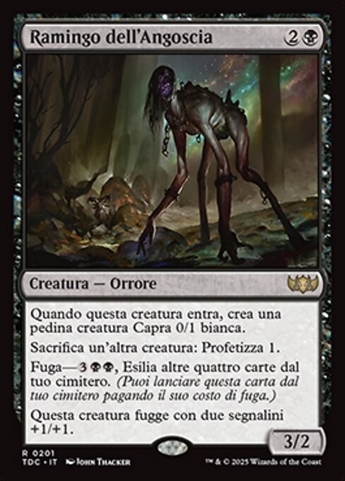 |  Variations— Parts— | 悲哀の徘徊者3 / 2 このクリーチャーが戦場に出たとき、白の0/1のヤギ・クリーチャー・トークン1体を生成する。 これでないクリーチャー1体を生け贄に捧げる:占術1を行う。 脱出― このクリーチャーは+1/+1カウンター2個が置かれた状態で脱出する。
