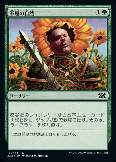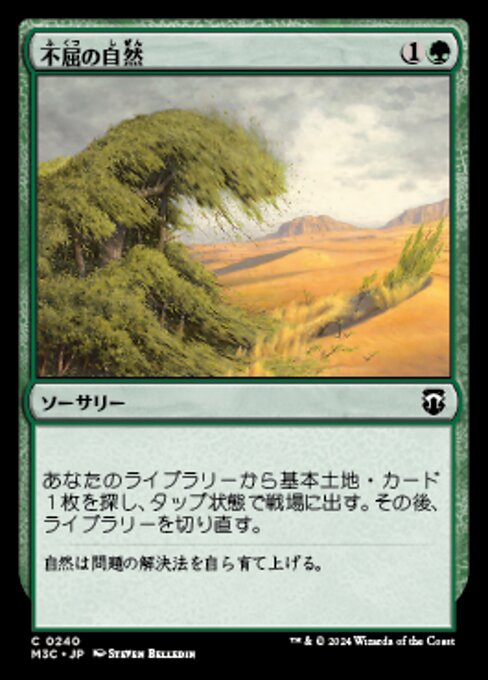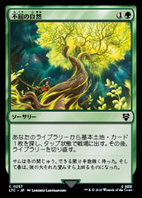 ![]() Variations— Parts— | 不屈の自然あなたのライブラリーから基本土地・カード1枚を探し、タップ状態で戦場に出す。その後、ライブラリーを切り直す。