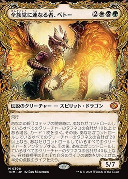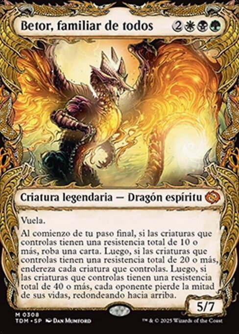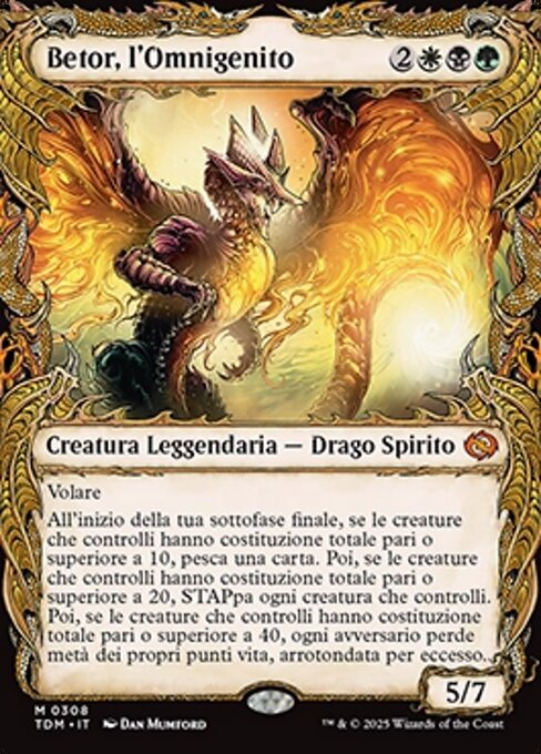 |  Variations : 2Parts— | Betor, Kin to All5 / 7 Flying At the beginning of your end step, if creatures you control have total toughness 10 or greater, draw a card. Then if creatures you control have total toughness 20 or greater, untap each creature you control. Then if creatures you control have total toughness 40 or greater, each opponent loses half their life, rounded up.
