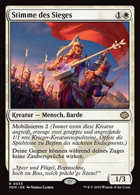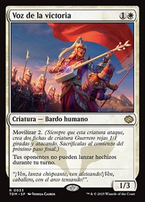 |  Variations : 1Parts : 2 | Voice of Victory1 / 3 Mobilize 2 (Whenever this creature attacks, create two tapped and attacking 1/1 red Warrior creature tokens. Sacrifice them at the beginning of the next end step.) Your opponents can't cast spells during your turn.