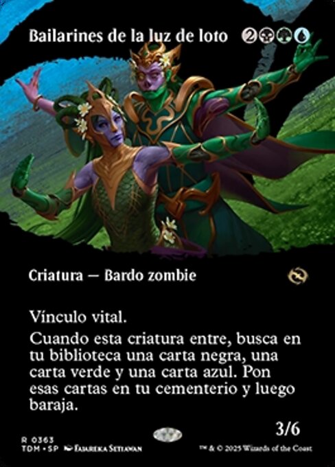 |  Variations : 1Parts— | Lotuslight Dancers3 / 6 Lifelink When this creature enters, search your library for a black card, a green card, and a blue card. Put those cards into your graveyard, then shuffle.