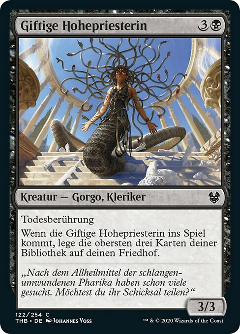 |  Variations— Parts— | Venomous Hierophant3 / 3 Deathtouch (Any amount of damage this deals to a creature is enough to destroy it.) When this creature enters, mill three cards. (Put the top three cards of your library into your graveyard.)