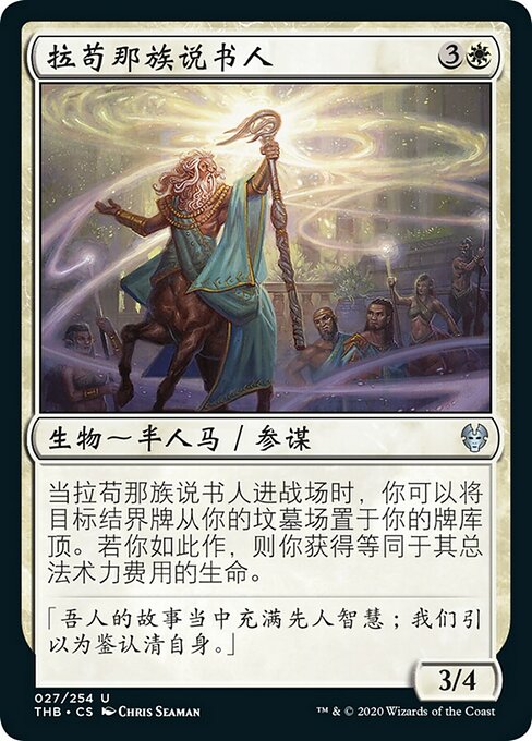 |  Variations— Parts— | Lagonna-Band Storyteller3 / 4 When this creature enters, you may put target enchantment card from your graveyard on top of your library. If you do, you gain life equal to its mana value.