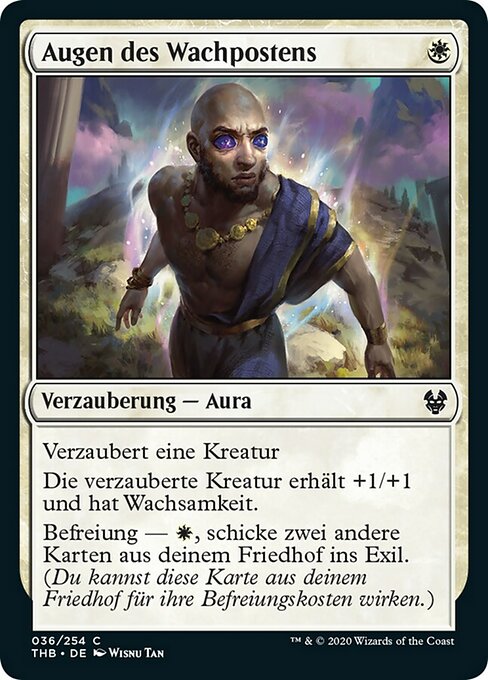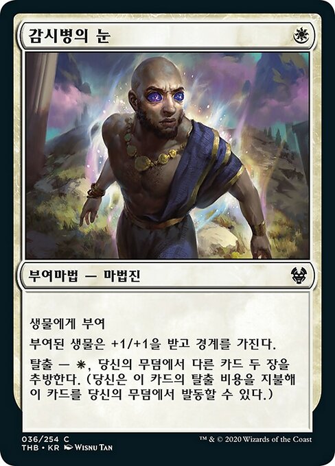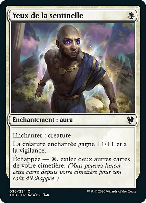 ![]() Variations— Parts— | Sentinel's EyesEnchant creature Enchanted creature gets +1/+1 and has vigilance. Escape—