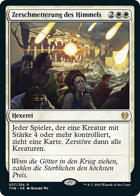 ![]() Variations : 1Parts— | Shatter the SkyEach player who controls a creature with power 4 or greater draws a card. Then destroy all creatures.
