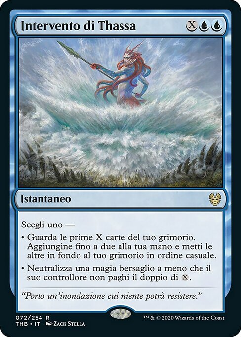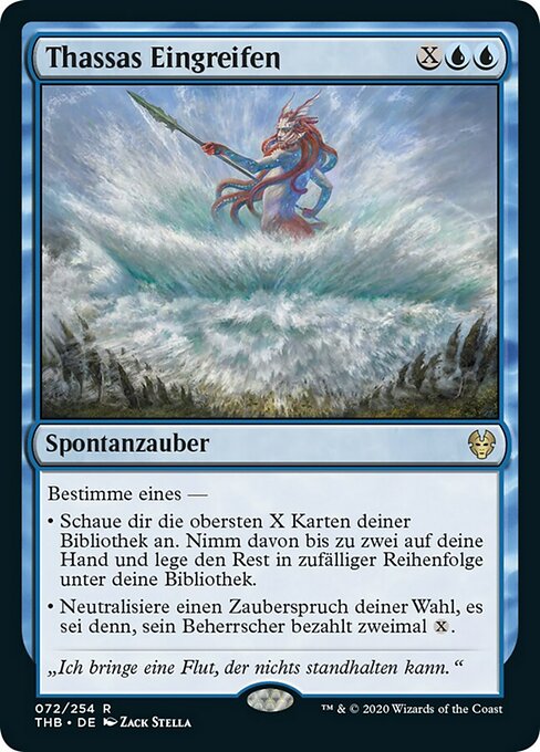 ![]() Variations : 1Parts— | Thassa's InterventionChoose one — • Look at the top X cards of your library. Put up to two of them into your hand and the rest on the bottom of your library in a random order. • Counter target spell unless its controller pays twice
