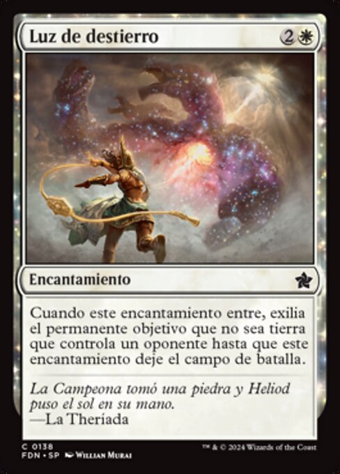 |  Variations— Parts— | Luz de destierroCuando la Luz de destierro entre al campo de batalla, exilia el permanente objetivo que no sea tierra que controla un oponente hasta que la Luz de destierro deje el campo de batalla.