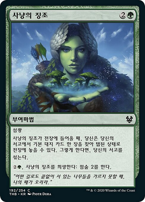 ![]() Variations— Parts— | Augure de la chasseFlash Quand l'Augure de la chasse arrive sur le champ de bataille, vous pouvez chercher dans votre bibliothèque une carte de terrain de base, la mettre sur le champ de bataille engagée et mélanger ensuite votre bibliothèque.