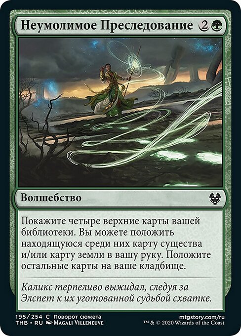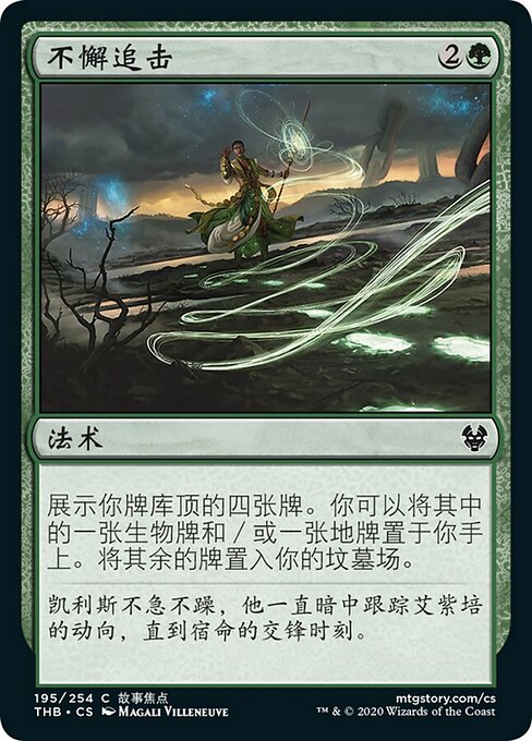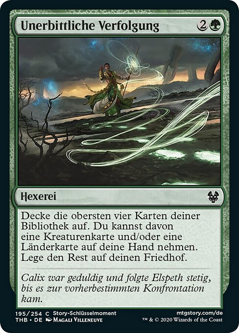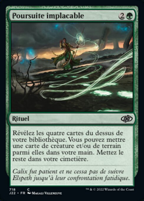 |  Variations— Parts— | Poursuite implacableRévélez les quatre cartes du dessus de votre bibliothèque. Vous pouvez mettre une carte de créature et/ou de terrain parmi elles dans votre main. Mettez le reste dans votre cimetière.