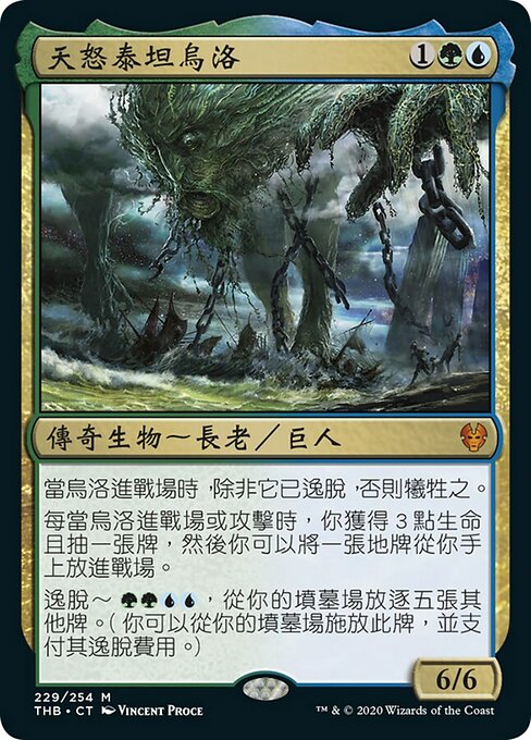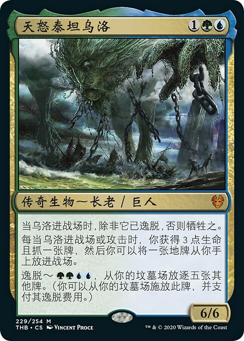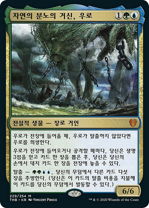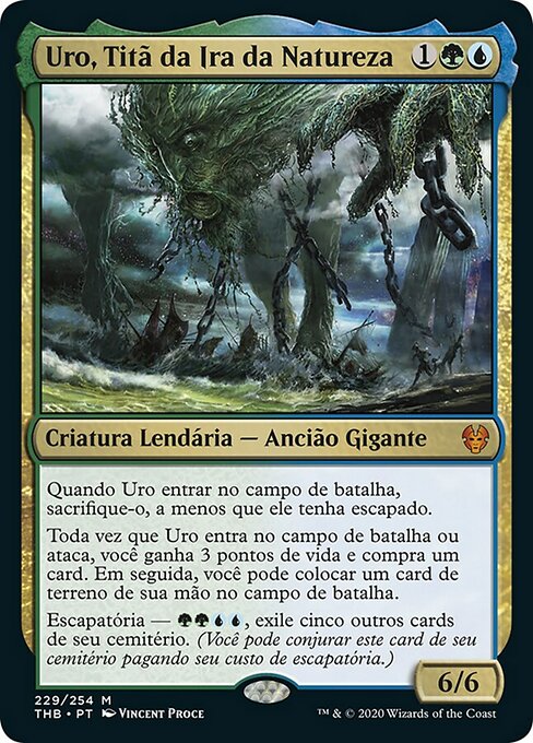 ![]() Variations— Parts— | Ouro, titan de la Rage de la nature6 / 6 Quand Ouro arrive sur le champ de bataille, sacrifiez-le à moins qu'il ne se soit échappé. À chaque fois qu'Ouro arrive sur le champ de bataille ou attaque, vous gagnez 3 points de vie et vous piochez une carte, puis vous pouvez mettre sur le champ de bataille une carte de terrain de votre main. Échappée —