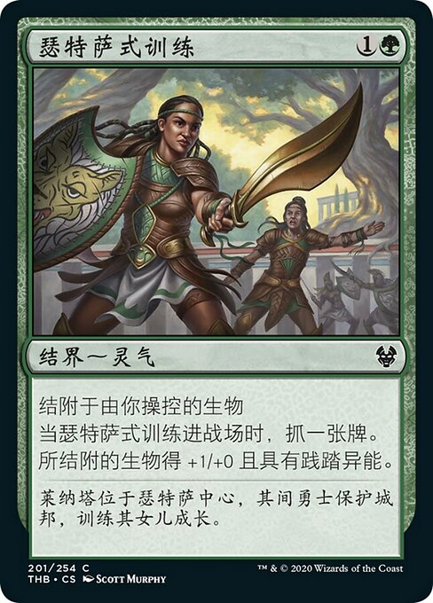 ![]() Variations— Parts— | 瑟特萨式训练结附于由你操控的生物 当瑟特萨式训练进战场时,抓一张牌。 所结附的生物得+1/+0且具有践踏异能。