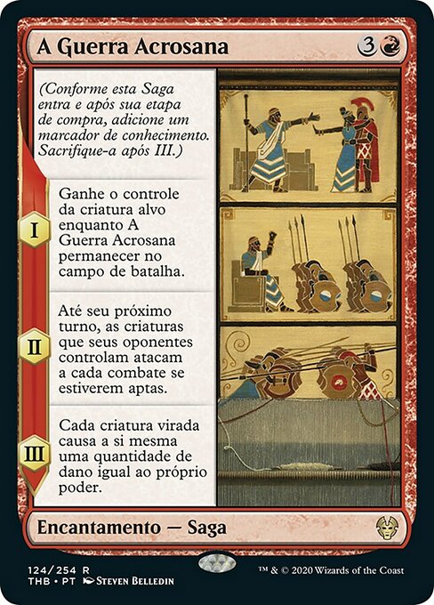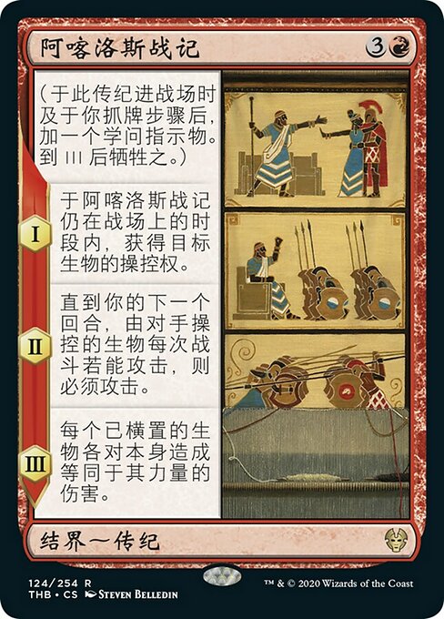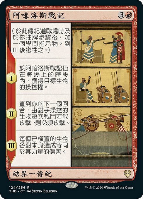 |  Variations— Parts— | 阿喀洛斯戰記(於此傳紀進戰場時及於你抽牌步驟後,加一個學問指示物。到III後犧牲之。) I — 於阿喀洛斯戰記仍在戰場上的時段內,獲得目標生物的操控權。 II — 直到你的下一個回合,由對手操控的生物每次戰鬥若能攻擊,則必須攻擊。 III — 每個已橫置的生物各對本身造成等同於其力量的傷害。