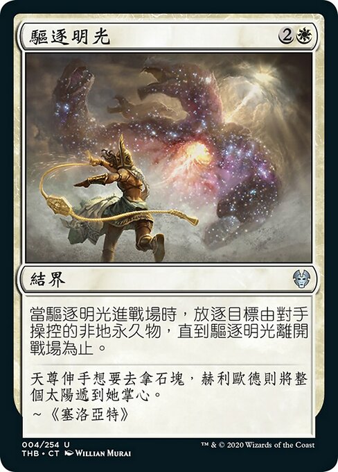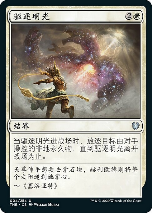 |  Variations— Parts— | 驅逐明光當驅逐明光進戰場時,放逐目標由對手操控的非地永久物,直到驅逐明光離開戰場為止。