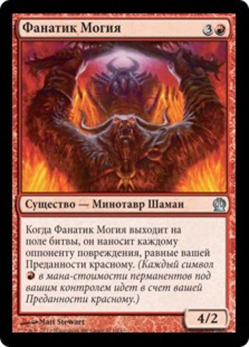 ![]() Variations— Parts—  | Fanatic of Mogis4 / 2 When this creature enters, it deals damage to each opponent equal to your devotion to red. (Each