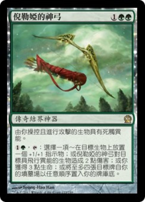 ![]() Variations— Parts— | Bow of NyleaAttacking creatures you control have deathtouch. • Put a +1/+1 counter on target creature. • Bow of Nylea deals 2 damage to target creature with flying. • You gain 3 life. • Put up to four target cards from your graveyard on the bottom of your library in any order.