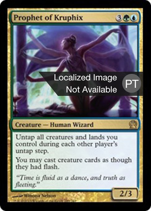 ![]() Variations— Parts— | Prophet of Kruphix2 / 3 Untap all creatures and lands you control during each other player's untap step. You may cast creature spells as though they had flash.
