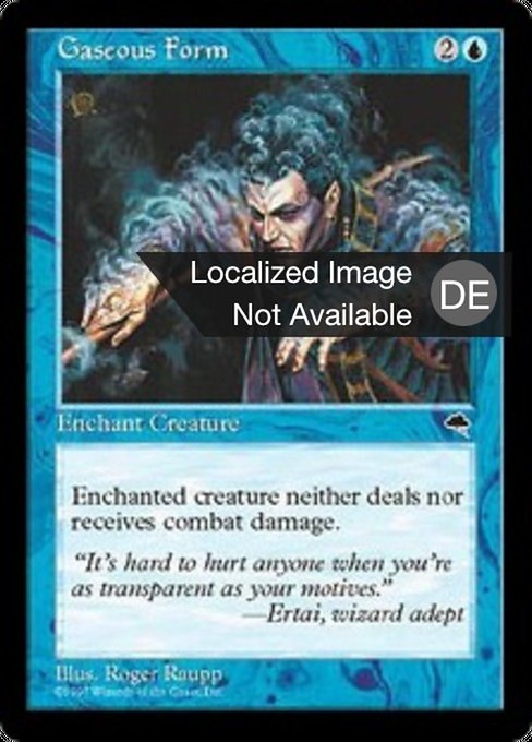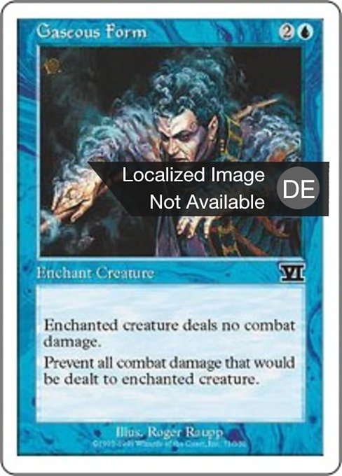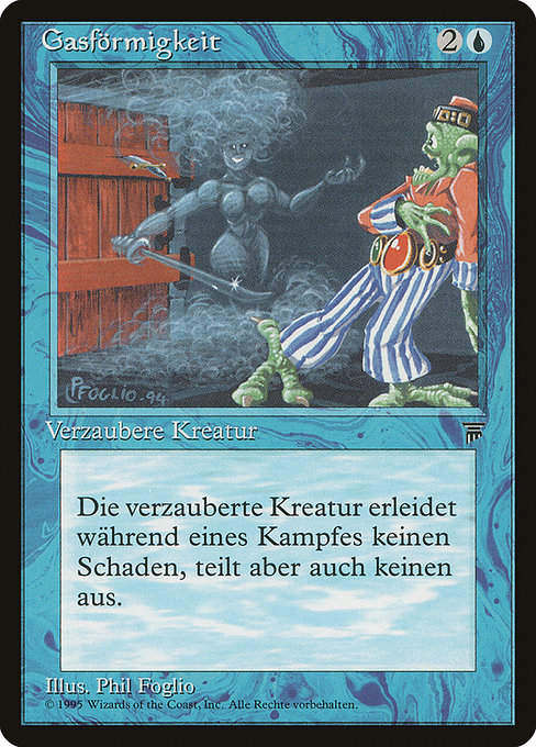 |  Variations— Parts— | GasförmigkeitDie verzauberte Kreatur erhält keinen Kampfschaden und teilt auch keinen aus.