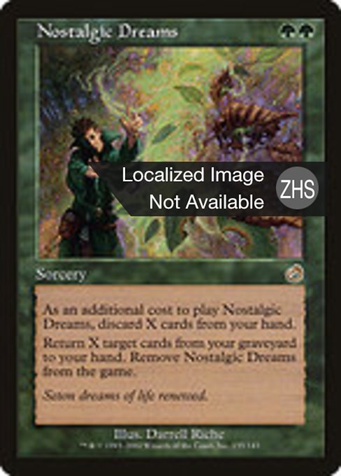 ![]() Variations— Parts— | Nostalgic DreamsAs an additional cost to cast this spell, discard X cards. Return X target cards from your graveyard to your hand. Exile Nostalgic Dreams.