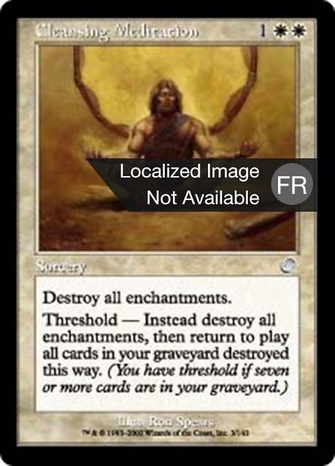 |  Variations— Parts— | Cleansing MeditationDestroy all enchantments. Threshold — If seven or more cards are in your graveyard, instead destroy all enchantments, then return all cards in your graveyard destroyed this way to the battlefield.