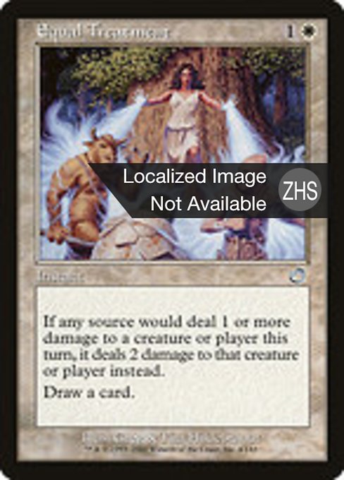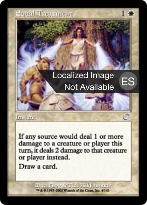 |  Variations— Parts— | Equal TreatmentIf any source would deal 1 or more damage to a permanent or player this turn, it deals 2 damage to that permanent or player instead. Draw a card.