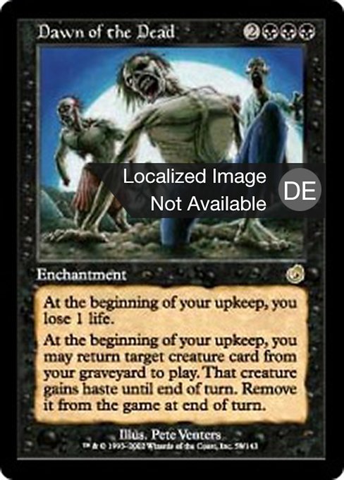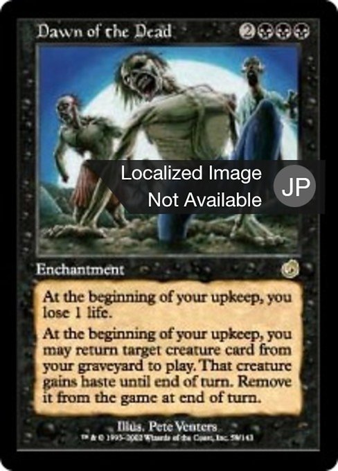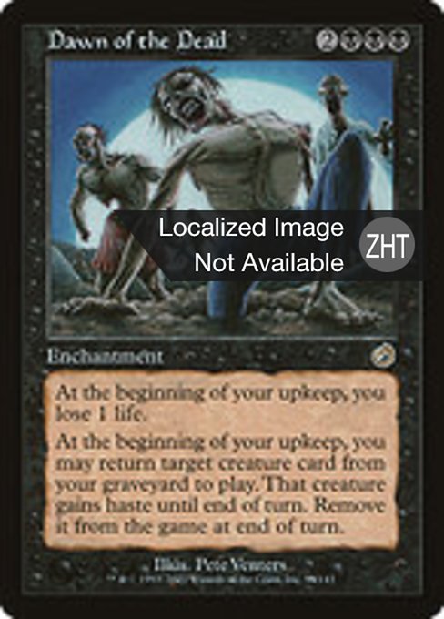|  Variations— Parts— | Dawn of the DeadAt the beginning of your upkeep, you lose 1 life. At the beginning of your upkeep, you may return target creature card from your graveyard to the battlefield. That creature gains haste until end of turn. Exile it at the beginning of the next end step.