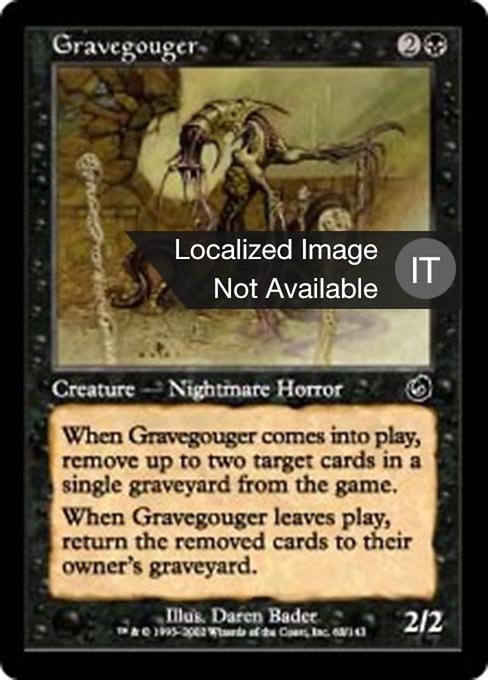 ![]() Variations— Parts— | Gravegouger2 / 2 When this creature enters, exile up to two target cards from a single graveyard. When this creature leaves the battlefield, return the exiled cards to their owner's graveyard.