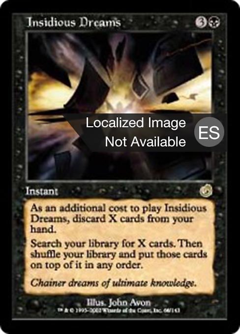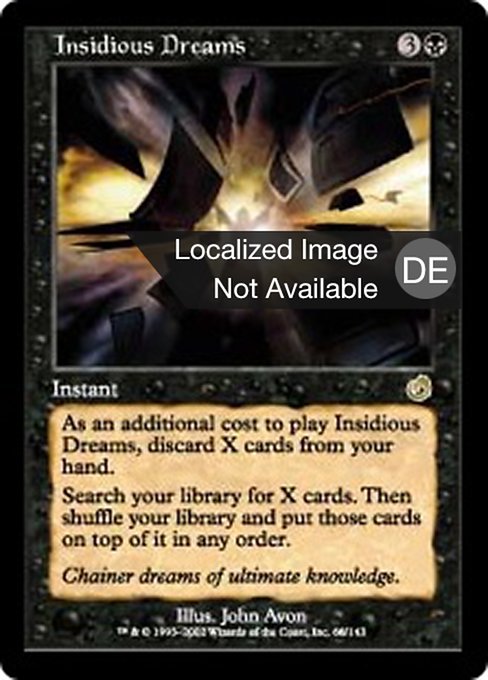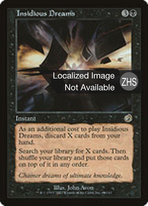 ![]() Variations— Parts— | Insidious DreamsAs an additional cost to cast this spell, discard X cards. Search your library for X cards, then shuffle and put those cards on top in any order.