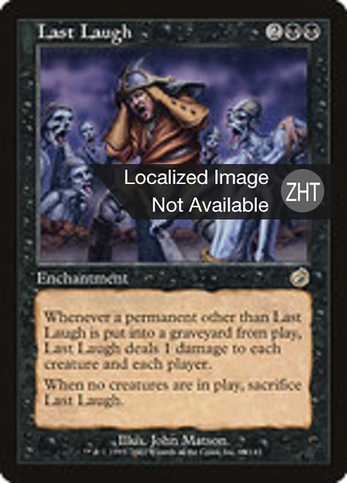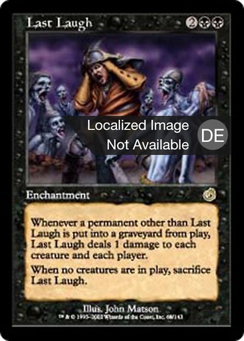 |  Variations— Parts— | Last LaughWhenever a permanent other than this enchantment is put into a graveyard from the battlefield, this enchantment deals 1 damage to each creature and each player. When no creatures are on the battlefield, sacrifice this enchantment.