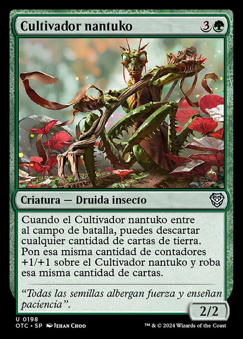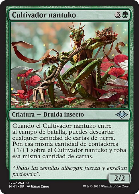 ![]() Variations— Parts— | Cultivador nantuko2 / 2 Cuando el Cultivador nantuko entre en juego, puedes descartar cualquier número de cartas de tierra de tu mano. Pon ese mismo número de contadores +1/+1 sobre el Cultivador nantuko y roba ese mismo número de cartas.