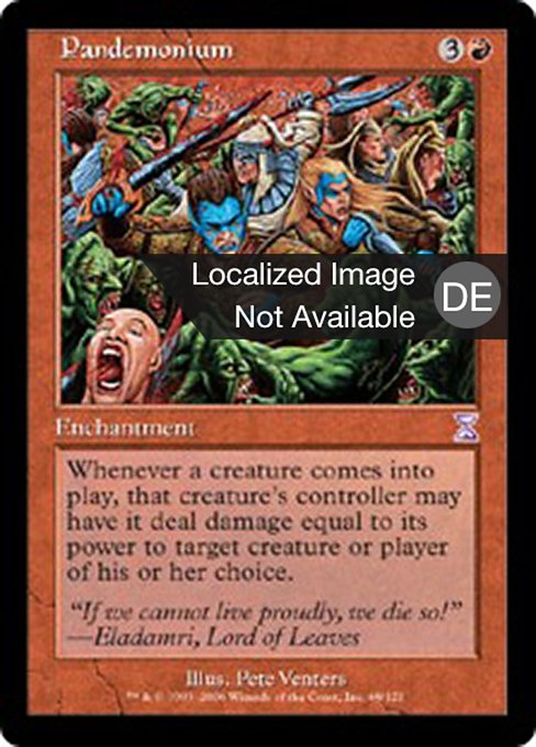 |  Variations— Parts— | PandemonioOgniqualvolta una creatura entra in gioco, il controllore di quella creatura può farle infliggere un ammontare di danni pari alla sua forza a una creatura o a un giocatore bersaglio a sua scelta.