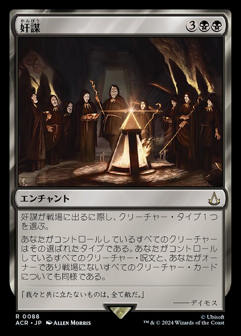 ![]() Variations— Parts— | 奸謀奸謀が場に出る際に、クリーチャー・タイプを1つ選ぶ。 あなたがオーナーである場にないクリーチャー・カードや、あなたがコントロールするクリーチャー呪文や、あなたがコントロールするクリーチャーは選ばれているタイプである。