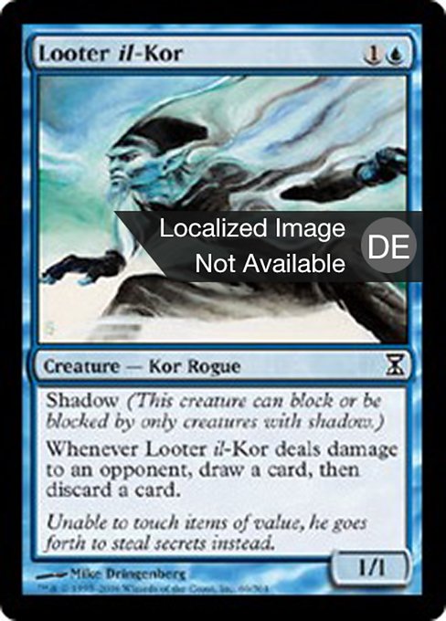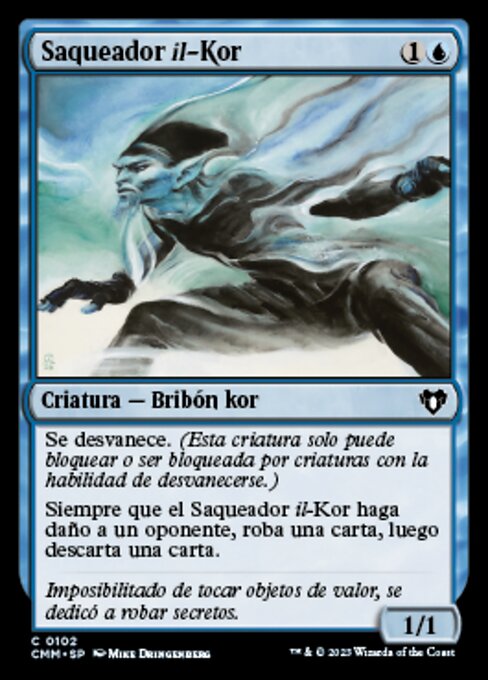 |  Variations— Parts— | Saqueador il-Kor1 / 1 Se desvanece (Esta criatura sólo puede bloquear o ser bloqueada por criaturas con la habilidad de desvanecerse.) Siempre que el Saqueador il-Kor haga daño a un oponente, roba una carta, luego descarta una carta.