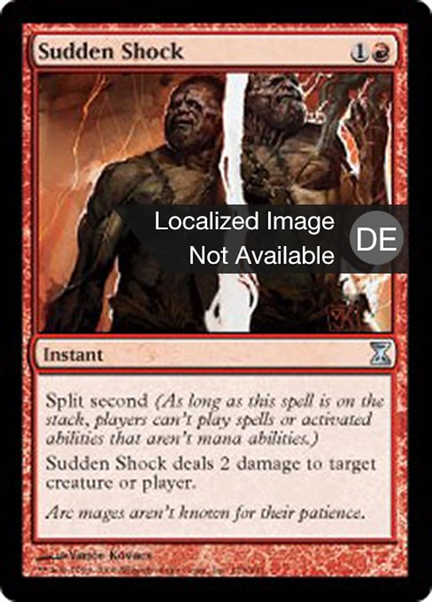 |  Variations— Parts— | Choc soudainFraction de seconde (Tant que ce sort est sur la pile, les joueurs ne peuvent pas jouer de sorts ou de capacités activées qui ne sont pas des capacités de mana.) Le Choc soudain inflige 2 blessures à une cible, créature ou joueur.